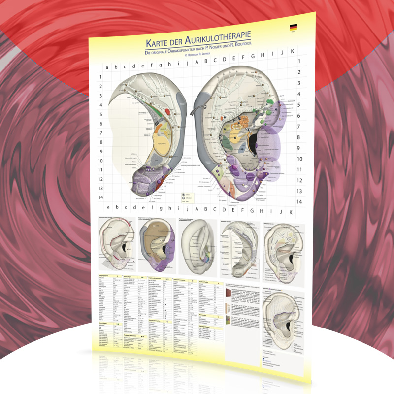 Diese Wandkarte gründet auf den originalen Somatotopen der Aurikulotherapie aus René Bourdiols Buch Éléments d'auriculothérapie vom 01. Januar 1980 (Maisonneuve/Moulins-les-Metz, ISBN 978-2716000765), einer Synopse von nach Körperstrukturen unterteilten Einzelgrafiken, die von Paul Nogier mit Hilfe von René Bourdiol Ende der 1960-er und Anfang der 1970-er Jahren auf der Grundlage der jahrzehntelangen Forschungen Paul Nogiers entwickelt worden waren.